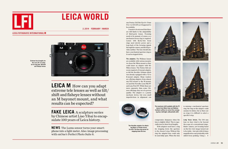 - Leica World: Extreme Adapting. Special lenses such as fish-eyes or tilt/shift are not available with M bayonets. We look at how they can still be adapted to the Leica M (Type 240) and what kind of photographic results can be expected.
